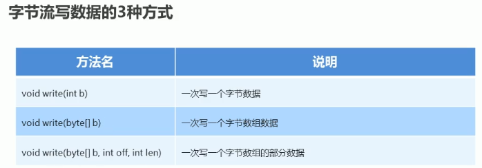 public static void main(String[] args) throws IOException { // 字节流的写操作 FileOutputStream f = null; try { f = new FileOutputStream("a.txt"); // 注意:1、如果文件不存在,会创建文件在写,前提是路径名必须正确,否则会报FileNotFoundException(系统找不到指定路径的错) // 2、写之前会清空文件原来的内容,如果不想清空原内容,而是在原内容后追加写入, // 需要FileOutputStream f = new FileOutputStream("a.txt",true),第二个参数就是追加续写的开关,如果不写默认清空 // 如果为true,那么创建对象的这行代码就不会清空文件 // 方法1:一次写一个字节,参数是int类型,对应码表 f.write(97); byte[] arr = {97, 98, 99, 100, 101, 102, 103, 104, 105}; // 方法2:一次写一个字节数组 f.write(arr); // 方法3:一次写一个字节数组的一部分,2表示从数组的第2个元素开始写,5表示写5个元素 f.write(arr, 2, 4); // 换行 windows是\r\n ,linux是\n ,mac是\r f.write(97); f.write("\r\n".getBytes()); f.write(98); f.write("\r\n".getBytes()); f.write(99); // 写完数据后要释放资源 f.close(); } catch (IOException e) { // TODO Auto-generated catch block e.printStackTrace(); } finally { // finally里的代码一定会被执行,除非JVM停止 if (f != null) { try { f.close(); } catch (IOException e) { e.printStackTrace(); } } } }