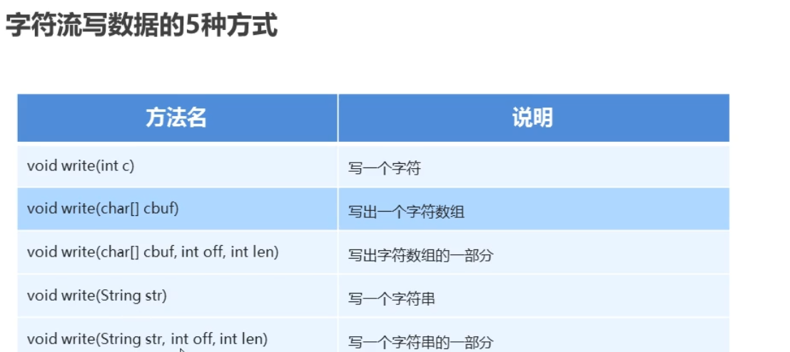 public static void main(String[] args) throws IOException { File f = new File("a.txt"); // 注意:1、如果文件不存在,就创建文件,但要保证父级路径存在,如果文件存在,FileWriter fw = new FileWriter(f)这句代码会清空文件 FileWriter fw = new FileWriter(f); char[] c = {'哈', 'b', 'c', 'd', 'e'}; // 注意:2、写int型整数,实际写出的是整数在码表的对应字母,如果想写数字本身,用字符串形式写入,写入的实际上就是字符串本身 fw.write(97); fw.write(c); fw.write(c, 0, 3); fw.write("我是谁哈哈哈"); fw.write("我是谁哈哈哈", 0, 3); fw.close(); }