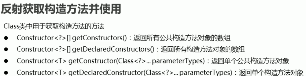 public class ConstructorDemo { public static void main(String[] args) throws ClassNotFoundException, NoSuchMethodException, SecurityException { // 获取Class对象 Class<?> clazz = Class.forName("com.unit1.test.reflect.Dog"); // 获取Class类的构造方法对象 // 1、获取所有公共构造方法对象getConstructors() Constructor[] constructors = clazz.getConstructors(); for (Constructor constructor : constructors) { System.out.println(constructor); } // 2、获取单个公共构造方法对象getConstructor(int.class),注意:这里的参数必须和我们要获取的构造方法里的参数一致 Constructor constructor = clazz.getConstructor(String.class, int.class); System.out.println(constructor); // 3、获取所有构造方法对象getDeclaredConstructors() Constructor[] declaredConstructors = clazz.getDeclaredConstructors(); for (Constructor constructor2 : declaredConstructors) { System.out.println(constructor2); } // 4、获取单个构造方法对象getDeclaredConstructor(int.class),注意:这里的参数必须和我们要获取的构造方法里的参数一致 Constructor declaredConstructor = clazz.getDeclaredConstructor(int.class); System.out.println(declaredConstructor); } }