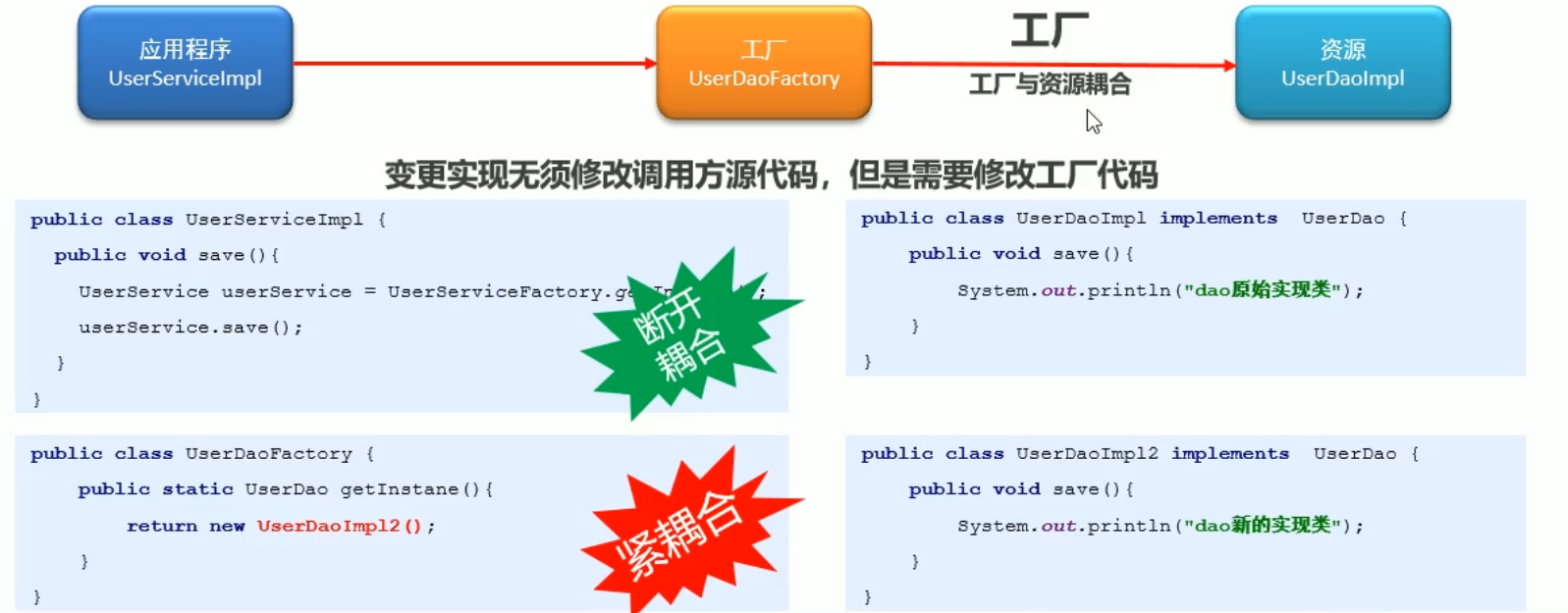 Ioc:控制反转,spring反向控制应用程序所需要使用的外部资源,可以理解为spring将类与类之间的耦合断开,改为配置文件和类之间的耦合。