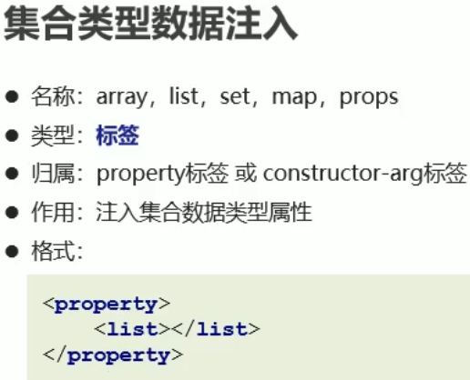 <?xml version="1.0" encoding="UTF-8"?> <beans xmlns="http://www.springframework.org/schema/beans" xmlns:xsi="http://www.w3.org/2001/XMLSchema-instance" xsi:schemaLocation="http://www.springframework.org/schema/beans https://www.springframework.org/schema/beans/spring-beans.xsd"> <bean id="userDao" class="com.hw.dao.impl.UserDaoImpl" > <property name="prop"> <props> <prop key="name">zs</prop> <prop key="age">23</prop> </props> </property> <property name="arrayList"> <list> <value>aaa</value> <value>bbb</value> </list> </property> <property name="set"> <set> <value>aaa</value> <value>bbb</value> </set> </property> <property name="array"> <array> <value>111</value> <value>222</value> </array> </property> <property name="map"> <map> <entry key="username" value="zs" /> <entry key="password" value="123456" /> </map> </property> </bean> <bean id="userService" class="com.hw.service.impl.UserServiceImpl"> <property name="userDao" ref="userDao" /> </bean> </beans>