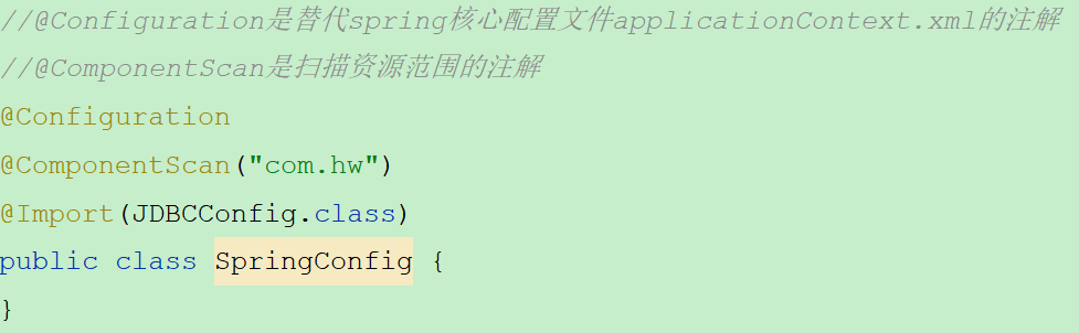 import com.alibaba.druid.pool.DruidDataSource; import org.springframework.beans.factory.annotation.Value; import org.springframework.context.annotation.Bean; import org.springframework.context.annotation.PropertySource; @PropertySource("classpath:jdbc.properties") public class JDBCConfig { @Value("${jdbc.driverClassName}") private String driverClassName; @Value("${jdbc.url}") private String url; @Value("${jdbc.username}") private String username; @Value("${jdbc.password}") private String password; @Bean("dataSource") public DruidDataSource getDataSource(){ DruidDataSource ds = new DruidDataSource(); ds.setDriverClassName(driverClassName); ds.setUrl(url); ds.setUsername(username); ds.setPassword(password); return ds; } }