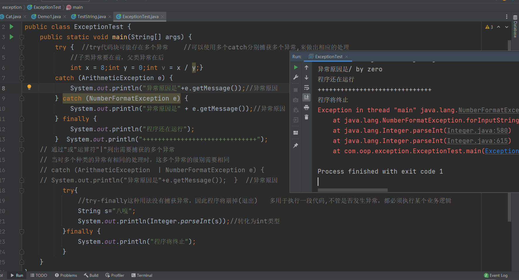 catch(Exception e) { //捕获异常,系统将异常封装成Exception对象e,传递给catch