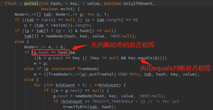 得到hash值,求出所在的索引,如果两个索引在同一位置,则会进行判断内容是否完全一致