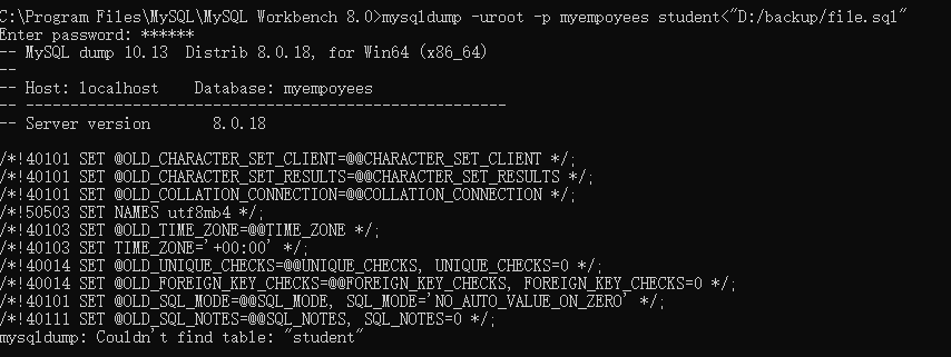 mysqldump -uroot -p myempoyees student<"D:/backup/fi1e.sql"