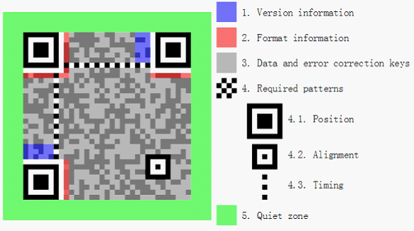 宏观结构图。图中颜色是为了显示方便而加的,实际中的QR code只有黑白两色(也没有灰色)。3个角落中的“回”字形方格是供解码软件定位用的。