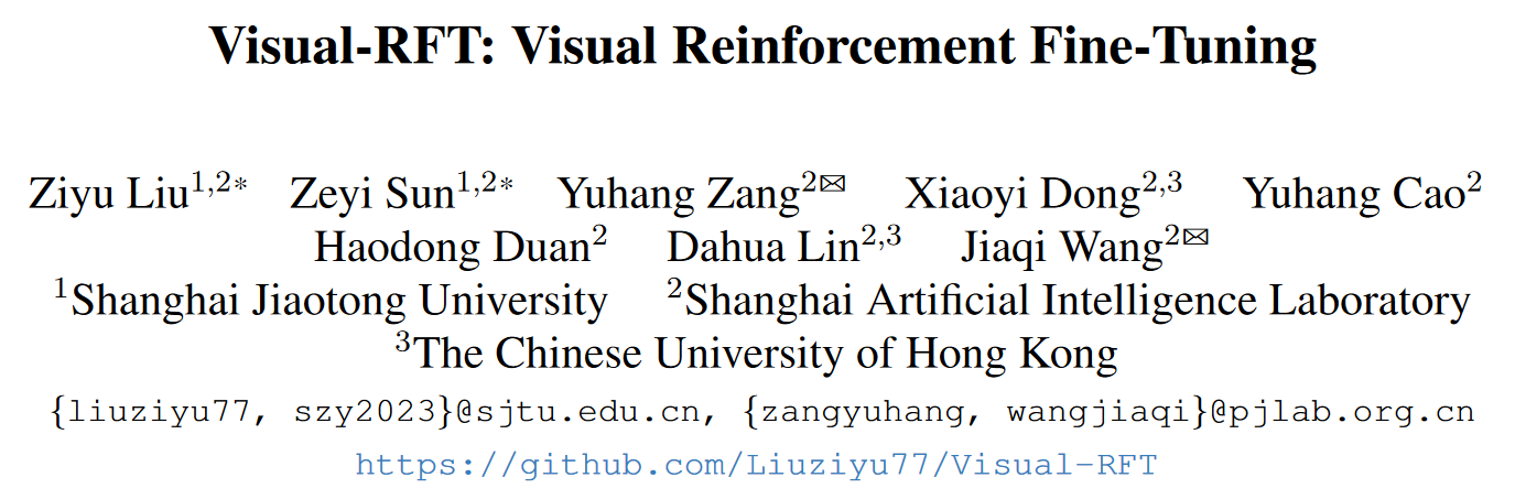 探索 VLM + RLVR 路线 :将DeepSeek R1的强化学习无缝迁移到LVLMs,提出 Visual-RFT
