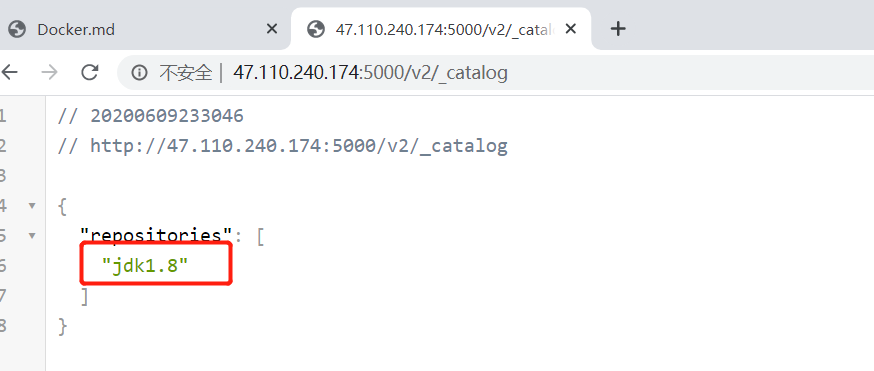 (3)打开浏览器 输入地址http://47.110.240.174:5000/v2/_catalog看到{"repositories":[]} 表示私有仓库搭建成功并且内容为空