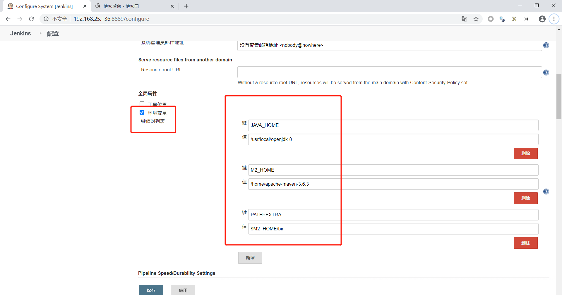 在Jenkins的设置中可以设置全局变量, jenkins主页面->Manage Jenkins->Configure System->Global Properties 中, 将Environment variables复选框选中,会出来List of variables, 填入以下内容: