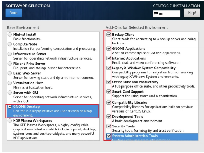 - 3.5 在软件选择界面,选中左侧GNOME Desktop,勾选右侧全部项目,点击完成,回到安装信息摘要界面。