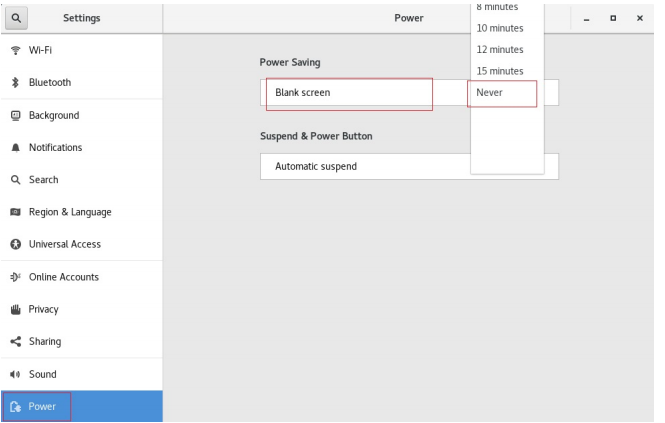 - 4.2选择Power,设置锁屏时间为Never,这样就不会自动锁屏了
