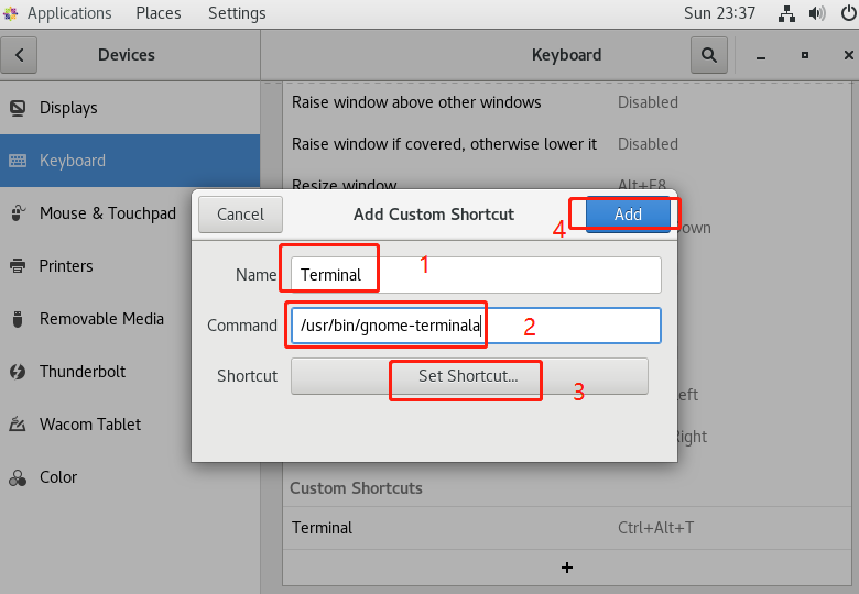 - 名称可以随意填写如Terminal,命令必须是: /usr/bin/gnome-terminal,快捷键我设置为”Ctrl + Alt+T”,点击”添加”