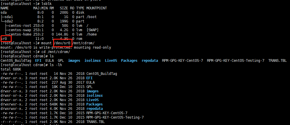 由以上图解可知,/dev/sr0代表光驱设备 => 挂载点 => /run/media/itheima/CentOS 7 x86_64文件夹