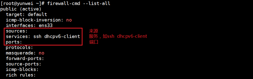 # firewall-cmd --list-all