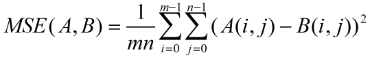 要衡量两个邻域块的相似度,有多种指标,均方误差(MSE)是最常用的相似度衡量指标之一。非局部均值滤波算法就是使用MSE来计算两个邻域块的相似度。邻域块的行列相同,假设均为m行n列,那么MSE的计算如下式,其中A(i,j)为点A邻域块中的点(i,j)的像素值,B(i,j)为点B邻域块中的相同位置点的像素值: