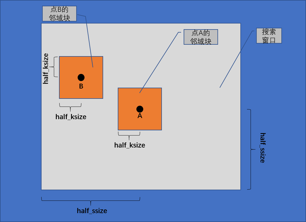 由以上可知,非局部均值滤波算法有两个重要的参数:ksize和ssize。假设点A为当前待滤波点,邻域块分别取以点A和点B为中心的ksize*ksize区域,矩形窗口(也称为搜索窗口)取以点A为中心ssize*ssize大小。由于ksize和ssize都是奇数,通常传入它们的半值:half_ksize和half_ssize。所以,邻域块的大小为(2*half_ksize+1)*(2*half_ksize+1),搜索窗口的大小为(2*half_ssize+1)*(2*half_ssize+1)。如下图所示: