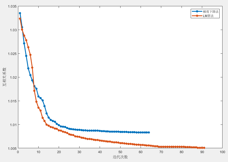 由上图可知,LM算法的优化结果比梯度下降法更理想,其收敛速度更快,且优化结果更接近最优解。
