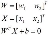 在我们最常见的x-y坐标系中,直线的一般形式为Ax+By+c=0。同理,在x1-x2坐标系中,我们分别使用w1代替A,w2代替B,x1代替x,x2代替y,b代替C,得到直线的一般表达式为w1x1+w2x2+b=0,写成向量形式: