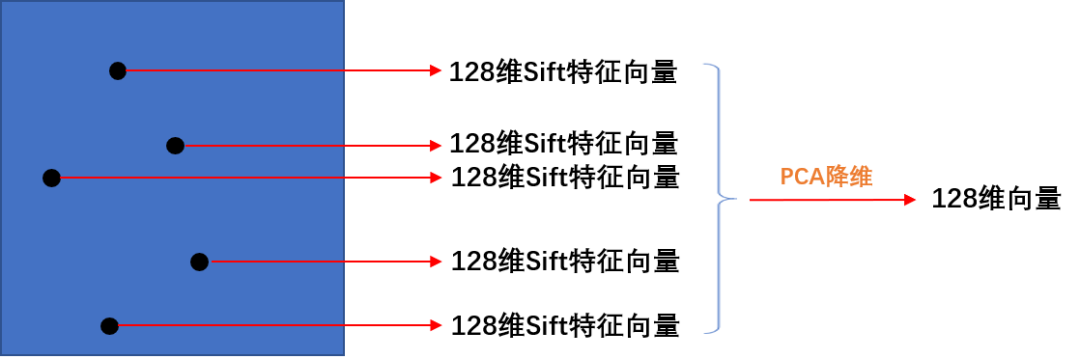 (2) 检测Sift特征,Sift特征是对图像上特殊点(可以理解为具有明显特征的角点)的向量描述,每个特殊点的Sift特征为一个128维向量。然而使用Sift算法在不同图像上检测到的特殊点的个数往往是不一样的,此时不同图像的128维向量的个数也不一样,因此不同图像中所有128维向量首尾拼接组成的n维向量的长度也不一样了。如果向量长度不一样,是不能输入分类器的,为了保证每张图像的特征向量长度一致,PCA降维就派上用场了,通常使用PCA降维算法把多个128维向量降维成1个128维向量。