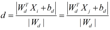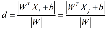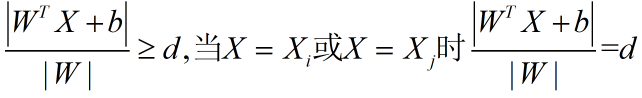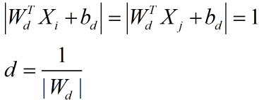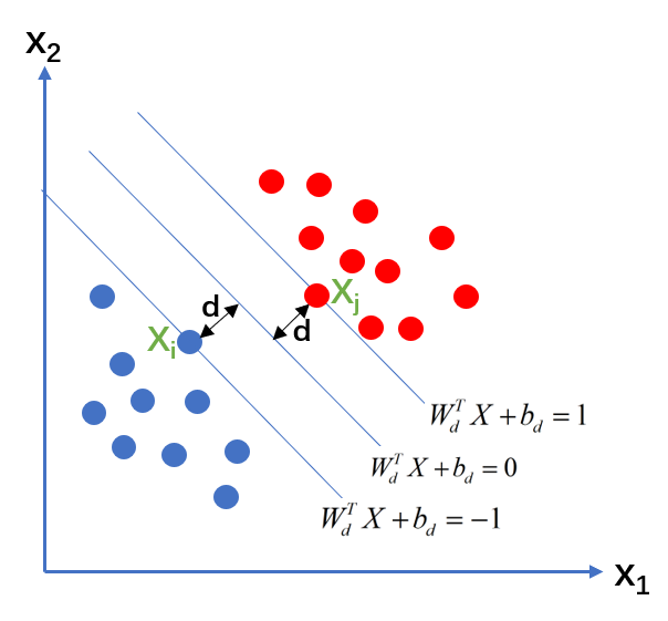 以上的每个二维向量在x1-x2平面坐标系中表现为一个点,我们的目标是使用一条直线把这些点分成两类,两类中距离最近的点分别为Xi和Xj,我们要寻找的直线在Xi和Xj的中间,也即Xi和Xj到直线的距离都为d,当d取得最大值的时候,这条直线就是我们要找的分类界限啦~