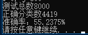运行以上代码,得到结果如下。对8000张图像进行分类,准确率只有55.2375%,分类的准确率与前文中我们使用KNN算法的分类结果相比,并不没有提升多少。当图像复杂之后,这些传统的数据分类算法就显得有些无力了。因此在以后的文章中,我们将尝试卷积神经网络与深度学习来进行分类。
