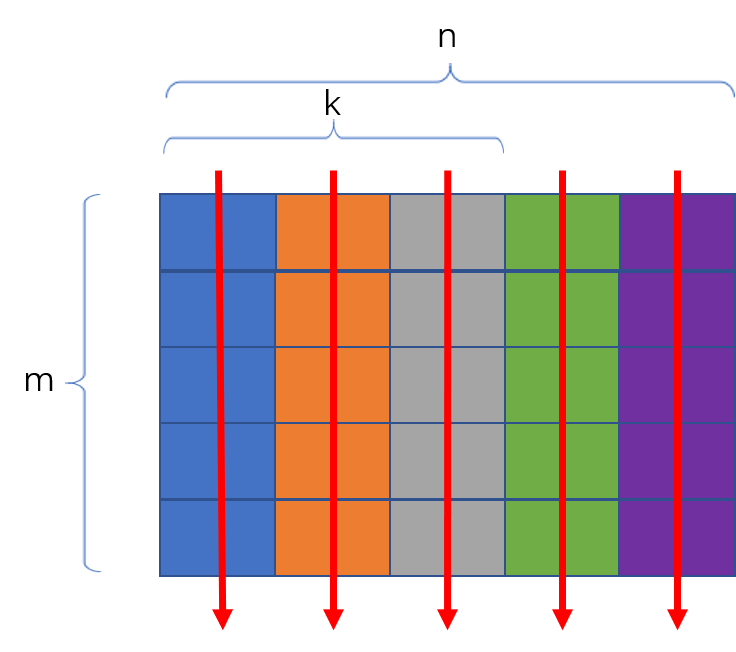 该计算方法对应Opencv接口中的CV_PCA_DATA_AS_ROW模式,把每列看作一个一维向量,通过PCA降维减少一维向量的个数,所以从整体来看,矩阵数据的行不变,但是列减少了。如下图所示,矩阵的原本尺寸是m行n列,降维之后就变成了m行k列的矩阵(k < n):