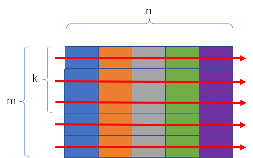 该计算方法就是我们在之前一篇讲PCA降维算法的文章中所讲述的方法,其对应Opencv接口中的CV_PCA_DATA_AS_COL模式,把每行看作一个一维向量,通过PCA降维减少一维向量的个数,所以从整体来看,矩阵数据的列不变,但是行减少了。如下图所示,矩阵的原本尺寸是m行n列,降维之后就变成了k行n列的矩阵的(k < m):