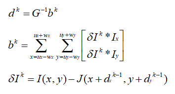 计算出d之后,根据d移动浮动图像上的跟踪点,在此基础上重复上述计算过程进行迭代优化,直到满足给定精度或达到最大迭代次数为止。迭代过程中,[Ix Iy]是不变的,故G保持不变,但因为δI与上一轮得到的光流有关,b在每轮迭代中是变化的。假设第k轮迭代得到的光流为dk=(dxk,dyk),第k-1轮迭代得到的光流为dk-1=(dxk-1,dyk-1),那么有:
