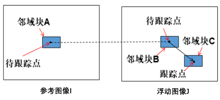 初始光流g决定初始跟踪点,剩余光流d在初始跟踪点的基础上进行迭代优化,获取精确跟踪点。剩余光流d的计算思路为:取参考图像I上待跟踪点和浮动图像J上跟踪点的邻域窗口作平方差,当邻域窗口的平方差最小,则认为得到了精确的剩余光流,也即跟踪到了对应位置的点,如下图所示。