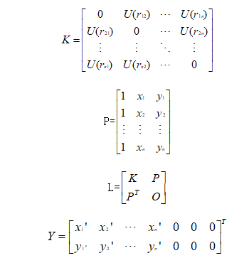 TPS形变的目标是求解一个函数f,使得f(Pi)=Pi’ (1≤i≤n),并且弯曲能量函数最小,同时图像上的其它点也可以通过插值得到很好的校正。可以把形变函数想象成弯折一块薄钢板,使这块钢板穿过给定的n个点,弯曲钢板所需能量可表示为: