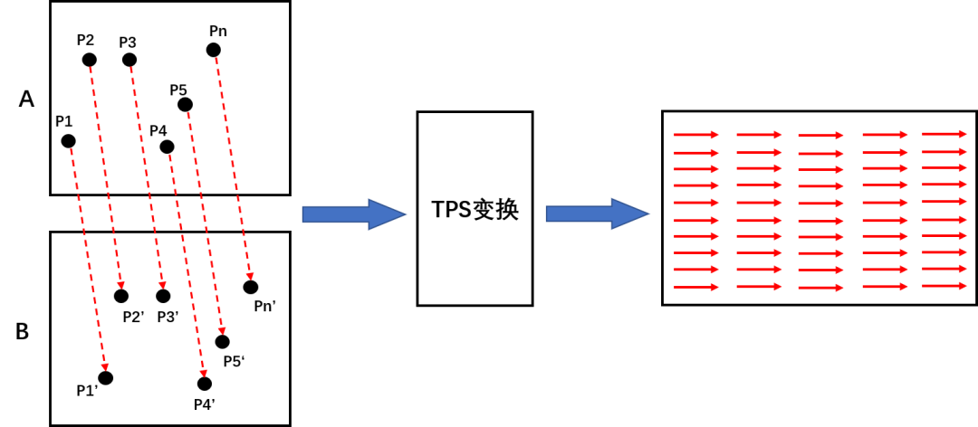 TPS变换通常用于图像配准,由于其输入为多组匹配点对,TPS变换之前需要先获取两张图像的多组匹配点对,常见的获取匹配点对算法为Shift、Surf、Orb,以及光流跟踪等。本文主要讲TPS变换的原理,暂时把获取匹配点对的算法放在一边。我们假设已经获取到两张图像的n组匹配点对:(P1(x1,y1),P1’(x1’,y1’))、P2((x2,y2),P2’(x2’,y2’))、…、(Pn(xn,yn), Pn’(xn’,yn’))。那么使用TPS变换计算图A与图B的坐标对应关系的过程如下。