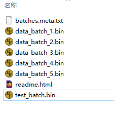 CIFAR-10是一个专门用于测试图像分类的公开数据集,其包含的彩色图像分为10种类型:飞机、轿车、鸟、猫、鹿、狗、蛙、马、船、货车。且这10种类型图像的标签依次为0、1、2、3、4、5、6、7、8、9。该数据集分为Python、Matlab、C/C++三个不同的版本,顾名思义,三个版本分别适用于对应的三种编程语言。因为我们使用的是C/C++语言,所以使用对应的C/C++版本就好,该版本的数据集包含6个bin文件,如下图所示,其中data_batch_1.bin~data_batch_5.bin通常用于训练,而test_batch.bin则用于训练之后的识别测试。