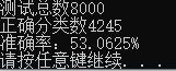 运行上述代码,得到结果如下。可以看到,识别的准确率从之前的29.3625%提升到了53.0625%,提升幅度还是很可观的,不过准确率还是达不到理想的水平,这是KNN算法本身的局限导致的,KNN算法对复杂图像的识别并不擅长,因此在接下来的文章中我们将尝试一下别的图像识别算法。