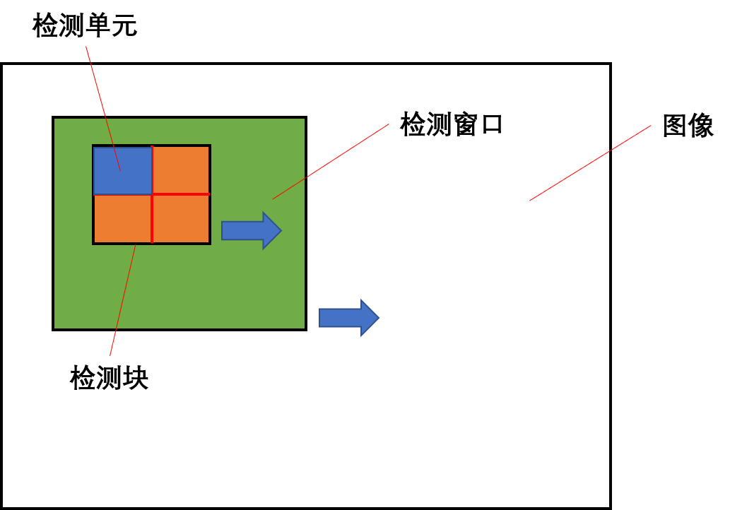 检测块:在检测窗口中选择的一个固定大小的矩形窗口,该窗口从左往右、从上往下滑动,每次滑动都有一个固定的步长。