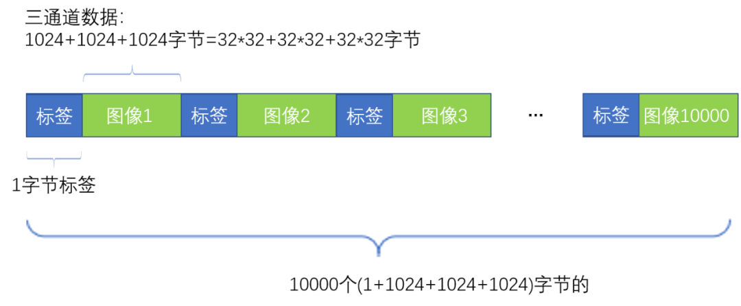 如下图所示,每个bin文件包含10000*3073个字节数据,在每个3073数据块中,第一个字节是0~9的标签,后面3072字节则是彩色图像的三通道数据:红通道 --> 绿通道 --> 蓝通道 (1024 --> 1024 --> 1024)。其中每1024字节的数据就是一帧单通道的32*32图像,3帧32*32字节的单通道图像则组成了一帧彩色图像。所以总体来说,每一个bin文件包含了10000帧32*32的彩色图像。