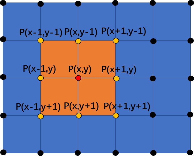 比如对于3*3窗口,如上图所示,点P(x, y)滤波之后的像素值为:
