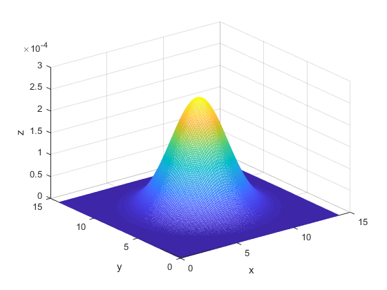 举个例子,画出当σ=2.0时15*15窗口的权重分布三维图像,如下图,可以看到越接近窗口的中心点(7, 7),权重值越大: