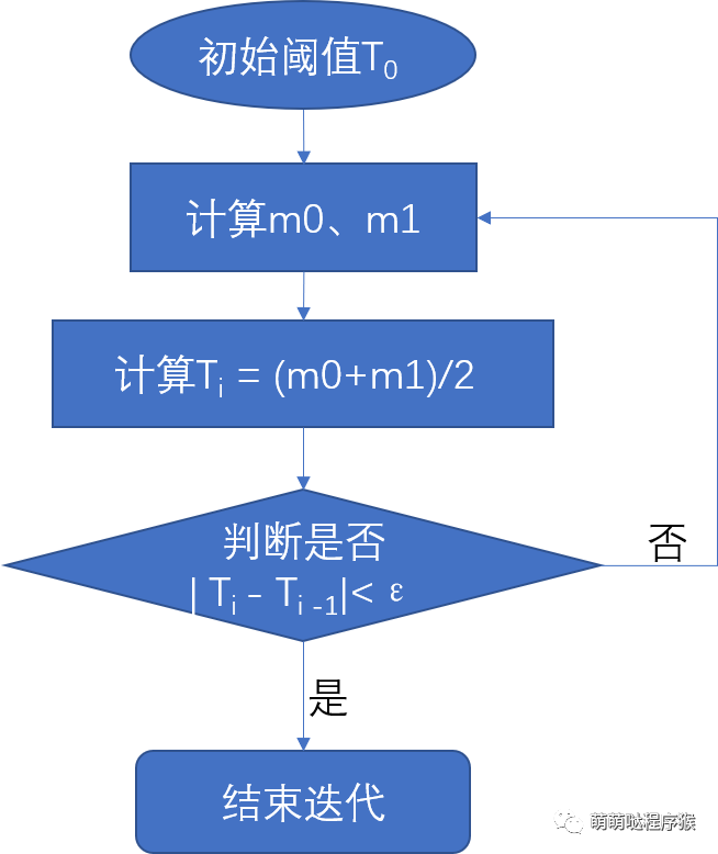 迭代法也属于自适应的阈值确定方法,其核心思路是通过多轮迭代运算来一步一步逼近最佳阈值。设置一个初始阈值T0,同样把图像的所有像素点分成两类,一类的像素值均小于等于T0(背景区域),另一类的像素值均大于T0(前景区域),然后分别计算背景区域与前景区域的像素平均值m0、m1,并取m0与m1之和的一半作为下一轮迭代的阈值。如果当前轮迭代得到的阈值与上一轮迭代的阈值相差很小,则结束迭代。迭代流程如下图所示: