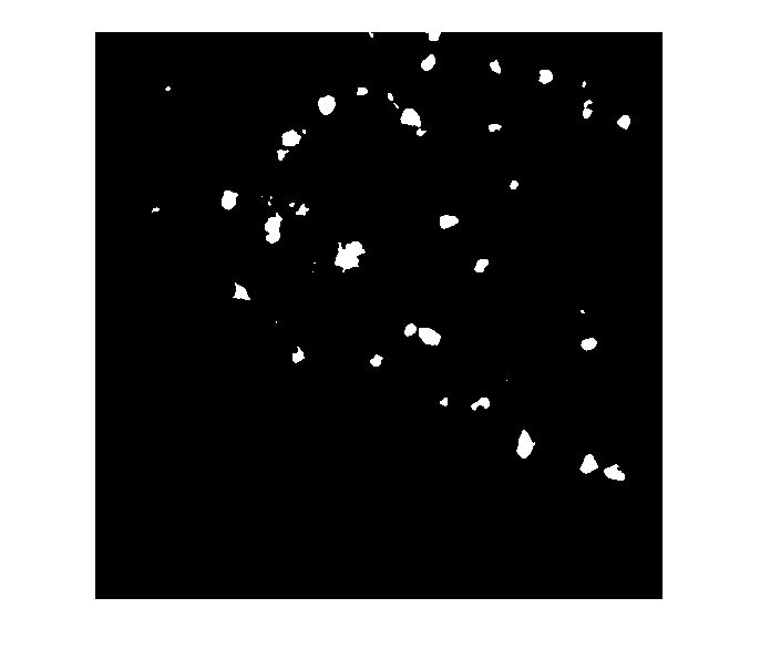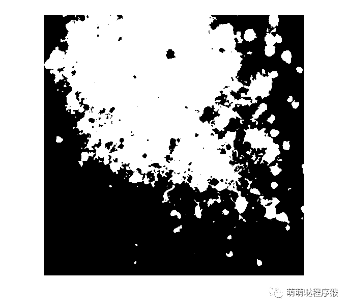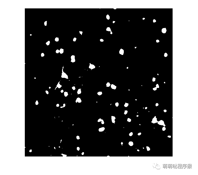 使用大津法确定阈值,对一张荧光细胞图像进行二值化,得到的结果如下图所示。可以看到细胞区域基本被标识为白色区域,与背景区域区别开来。