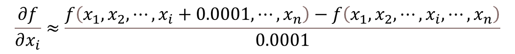 所以可以取一个很小的△xi值(比如0.0001)来近似计算xi的偏导数: