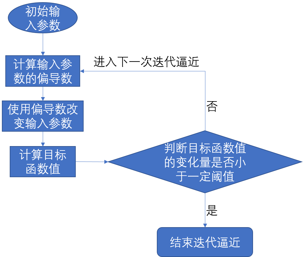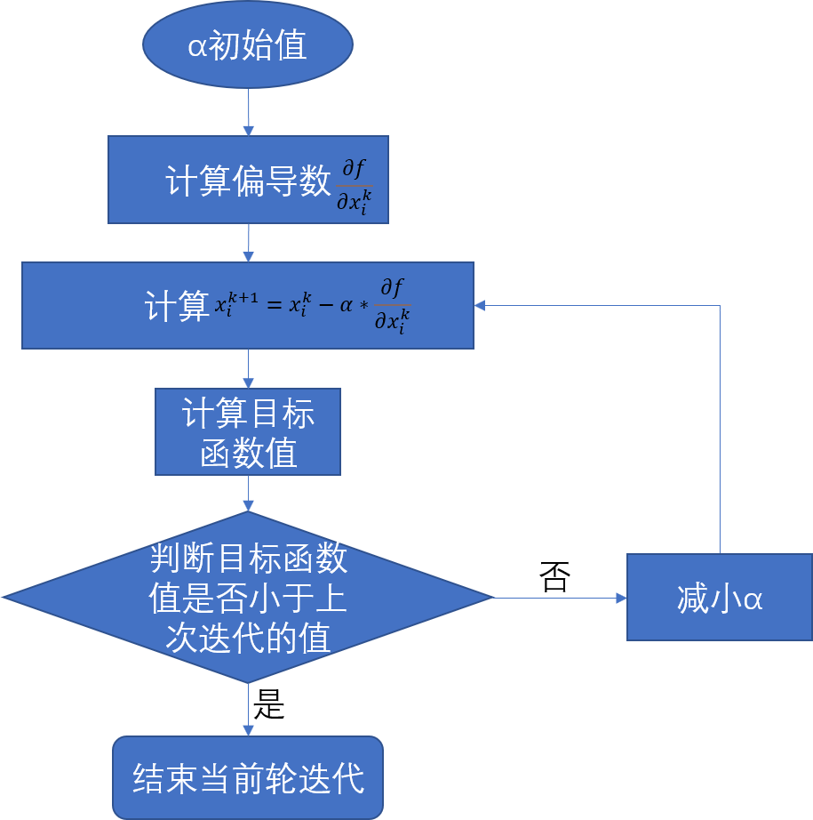 1. 刚开始α取一个很大的值,在每一次迭代逼近过程中,如果当前次计算得到的目标函数值大于上次的目标函数值,则减小α步长并重新计算目标函数值,直到当前次目标函数值小于上次目标函数值则停止减小α,并将其作为当前次下降的步长。每一轮迭代逼近的流程图如下图所示: