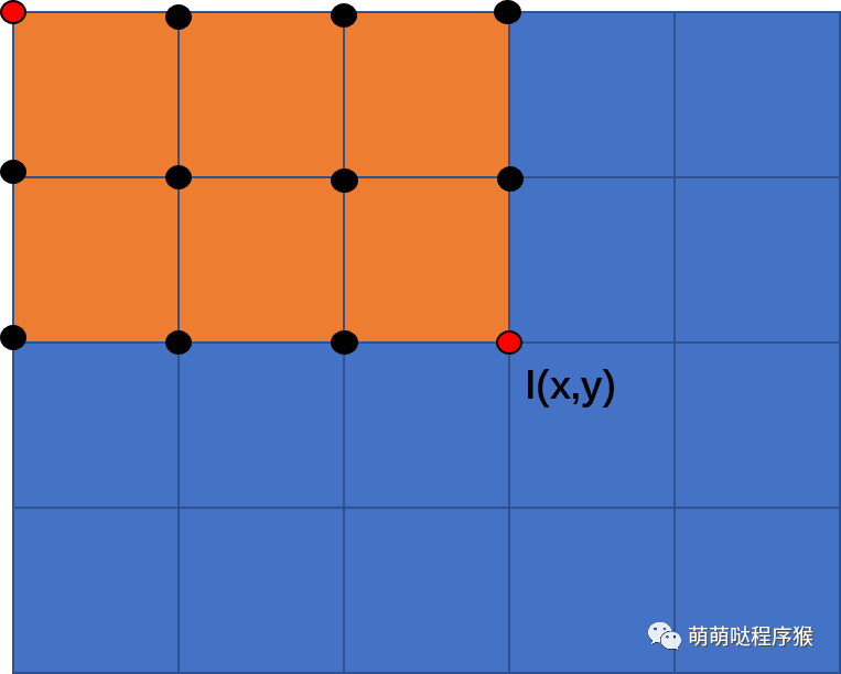 从直观来说,一张图像就是一个矩形,这个矩形中每个像素点的积分值,就是以图像左上角像素点为左上角顶点,以该像素点为右下角顶点的矩形中包含的所有元素之和。如下图所示,点(x,y)处的积分值为矩形区域中所有像素之和(包括该点)。