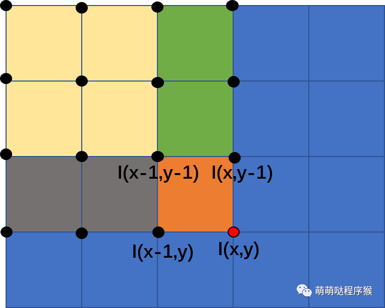 实际计算积分图的时候,为了提高计算效率,通常不会对每一个像素点都重新计算矩形区域包含的所有元素值之和,而是利用相邻点的积分值实现快速计算,如下图所示,点(x,y)的积分值可以使用点(x-1,y)与点(x,y-1)的积分值之和,然后减去重叠区域,也就是减去点(x-1,y-1)的积分值,最后再加上点(x,y)的像素值得到点(x,y)的积分值。