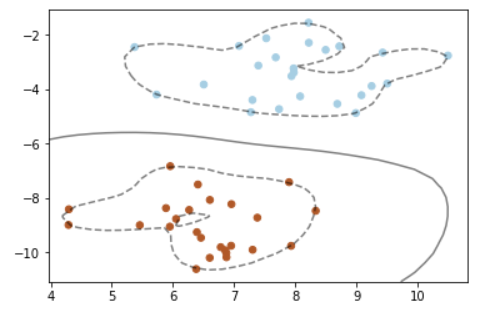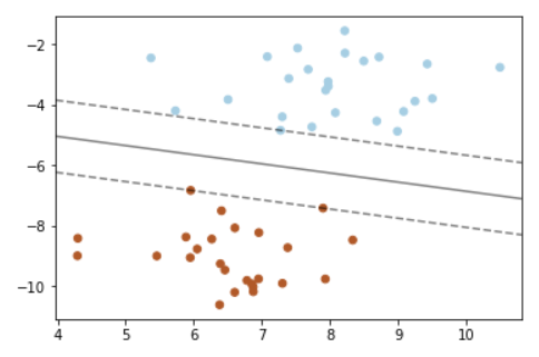 ############################# 支持向量机的核函数 ####################################### #导入numpy import numpy as np #导入画图工具 import matplotlib.pyplot as plt #导入支持向量机svm from sklearn import svm #导入数据集生成工具 from sklearn.datasets import make_blobs #先创建50个数据点,让他们分为两类 X,y = make_blobs(n_samples=50,centers=2,random_state=6) #创建一个线性内核的支持向量机模型 clf = svm.SVC(kernel = 'linear',C=1000) clf.fit(X,y) #把数据点画出来 plt.scatter(X[:, 0],X[:, 1],c=y,s=30,cmap=plt.cm.Paired) #建立图像坐标 ax = plt.gca() xlim = ax.get_xlim() ylim = ax.get_ylim() #生成两个等差数列 xx = np.linspace(xlim[0],xlim[1],30) yy = np.linspace(ylim[0],ylim[1],30) YY,XX = np.meshgrid(yy,xx) xy = np.vstack([XX.ravel(),YY.ravel()]).T Z = clf.decision_function(xy).reshape(XX.shape) #把分类的决定边界画出来 ax.contour(XX,YY,Z,colors='k',levels=[-1,0,1],alpha=0.5,linestyles=['--','-','--']) ax.scatter(clf.support_vectors_[:, 0],clf.support_vectors_[:, 1],s=100,linewidth=1,facecolors='none') plt.show()