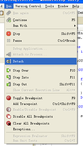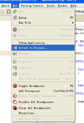 第二种方法,无需关掉Unity,在MonoDevelop的Run菜单下选择Attach to Process