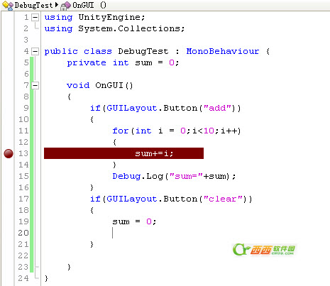 回到MonoDevelop,在脚本里面我们打一个断点(在行号左边点一下)