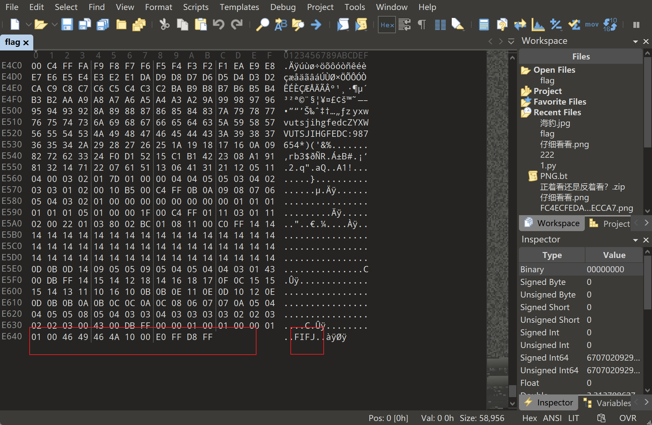 大部分文件有其固定的文件结构,常见的图片格式如 PNG、JPG 等都是由一系列特定的数据块组成的。在许多非文本文件的开头,都会有一片区域来显示这个文件的格式,这就是文件头标志。例如 JPG 开头通常是ÿØÿà..JFIF这样的模式,看到这个模式就知道是 JPG 文件。