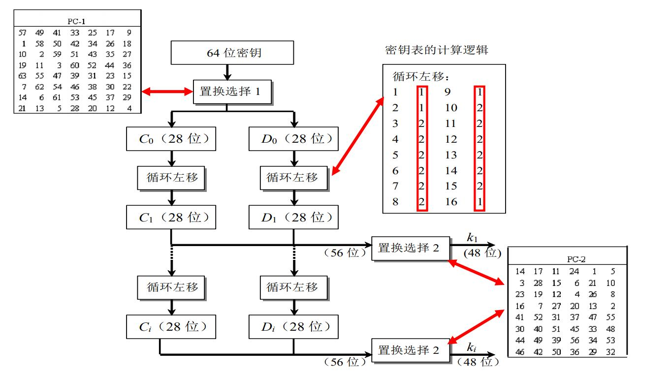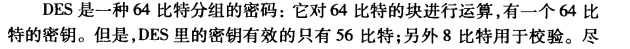 DES算法把64位的明文输入块变为64位的密文输出块,它所使用的密钥也是64位(实际用到了56位,第8、16、24、32、40、48、56、64位是校验位, 使得每个密钥都有奇数个1),其算法主要分为两步: