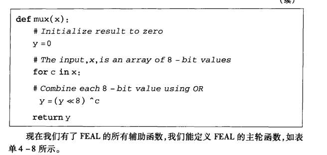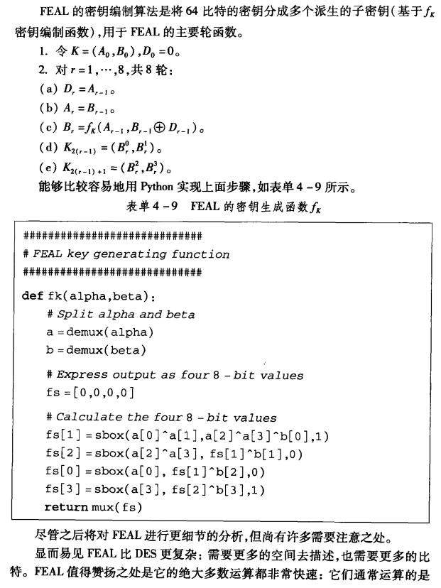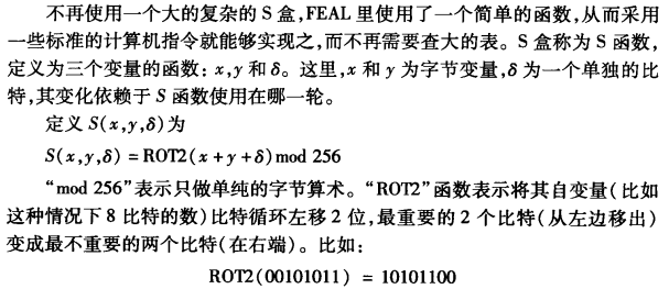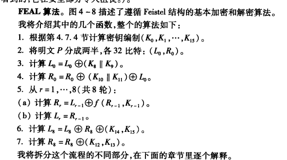 这是一套类似美国DES的分组加密算法。FEAL被提出的原意是着眼于当时的DES只用硬件去实现他,因此不适用于较小的系统。至于FEAL加密算法的真正加密结构,则与DES有极大的差异。FEAL完全没有使用置换函数来搅乱加密或解密过程中的数据,更没有如DES般具有神秘的S盒。FEAL使用了异或(XOR)、旋转(Rotation)、加法与模(Modulus)运算。