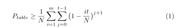 The chance of finding a key by using a table of m rows of t keys is given in the